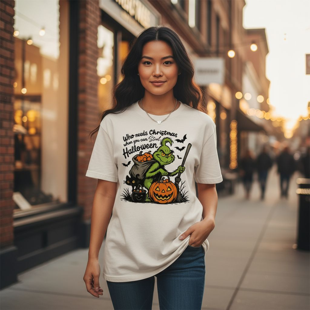 Celebrate the spooky season with the Grinch Stole Halloween Tee or sweatshirt! This natural/light cream unisex t-shirt is perfect for any Halloween lover. Who needs Christmas when you can steal the spotlight with this playful tee? Available now.