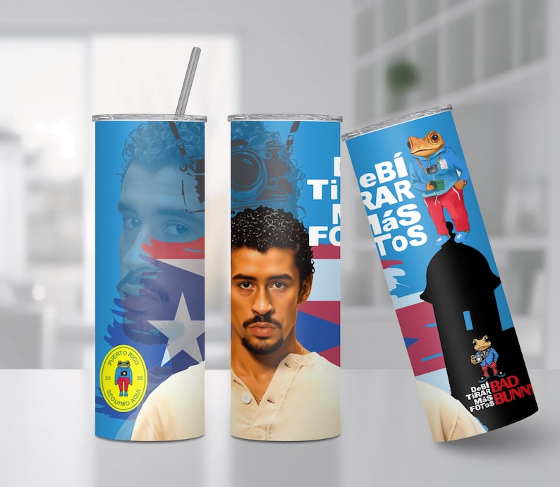 This 20 oz stainless steel tumbler features a vibrant Puerto Rico 2025 Bad Bunny design, combining durability with cultural flair. Its double-wall insulation keeps beverages hot or cold for hours, while the included straw offers convenient sipping. Ideal for fans seeking a stylish, functional drinkware piece that celebrates Puerto Rican pride and contemporary music culture.